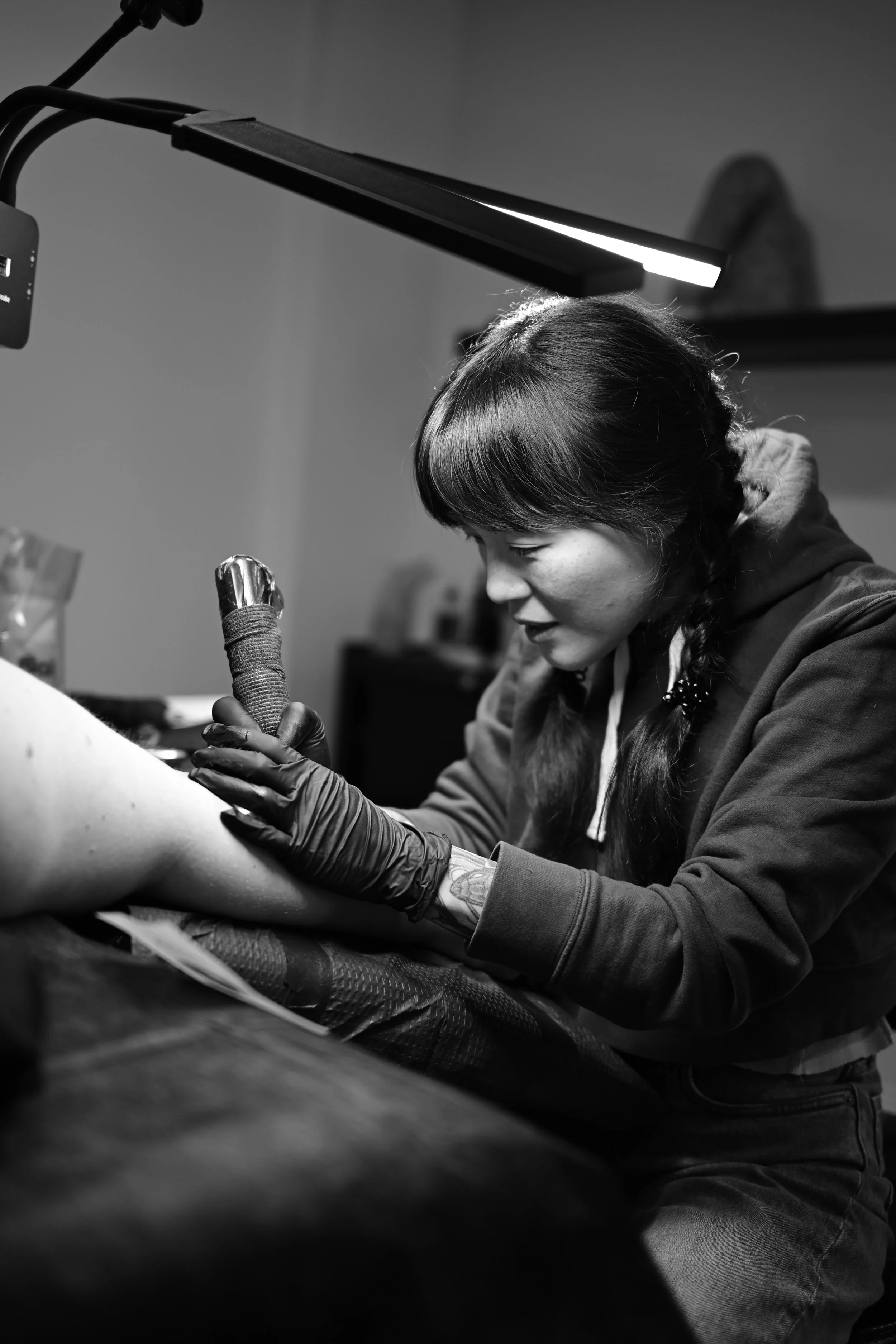 Starting with handpoking in 2022, Lee now works primarily with the machine. In her spare time, you can find Choon hiking, climbing, or putzing around in the pottery studio.